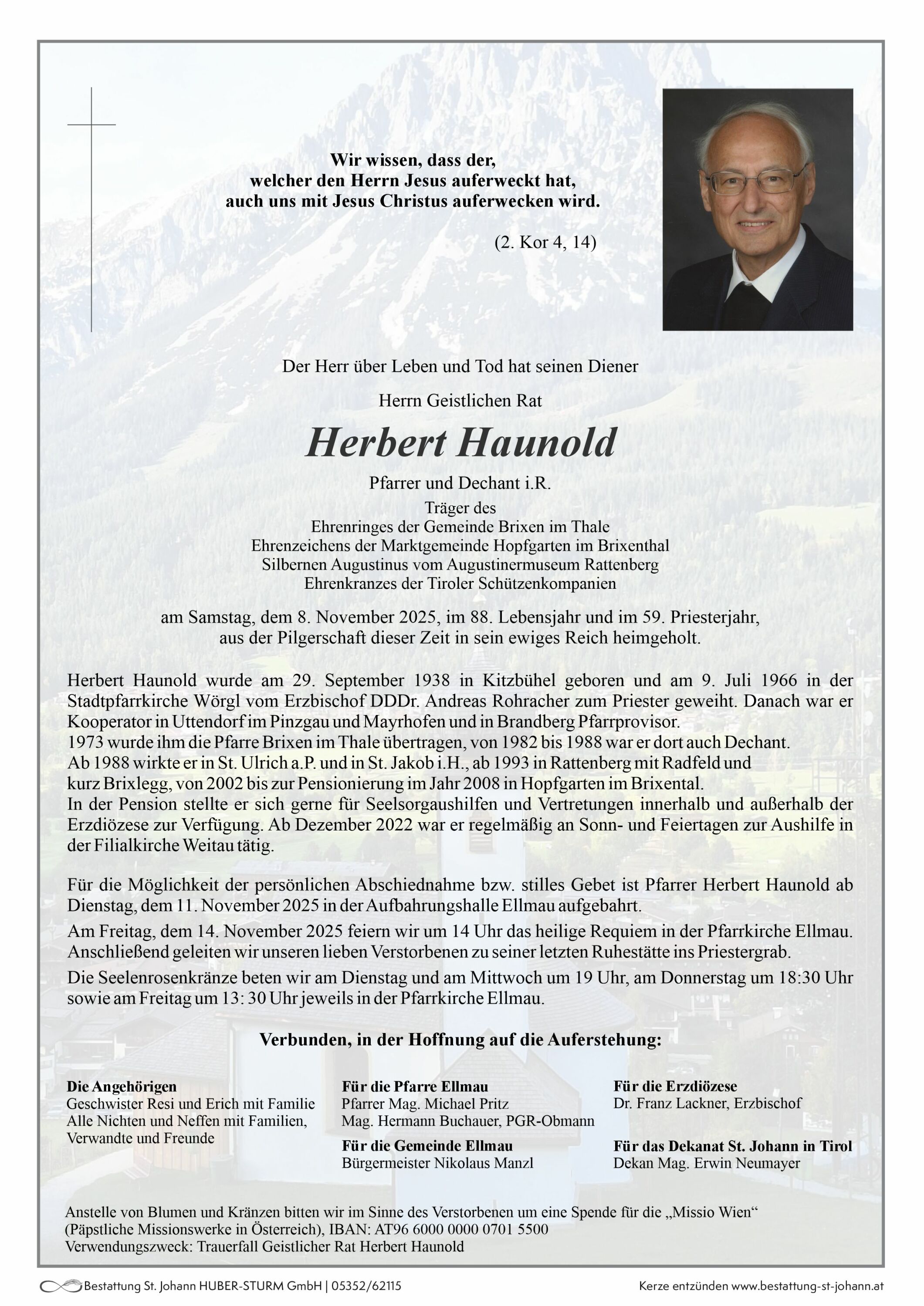 14.11.2025 Beerdigung von Pfarrer und Dechant i. R. Herbert Haunold (Abordnung) Heute nahmen wir Abschied von Geistlichen Rat Herbert Haunold, einem langjährigen Unterstützer unserer Kompanie. Stellvertretend für die Kompanie erwiesen Obj. Josef Stubenvoll und Fähnrich Peter Walser, Pfarrer Herbert die letzte Ehre.