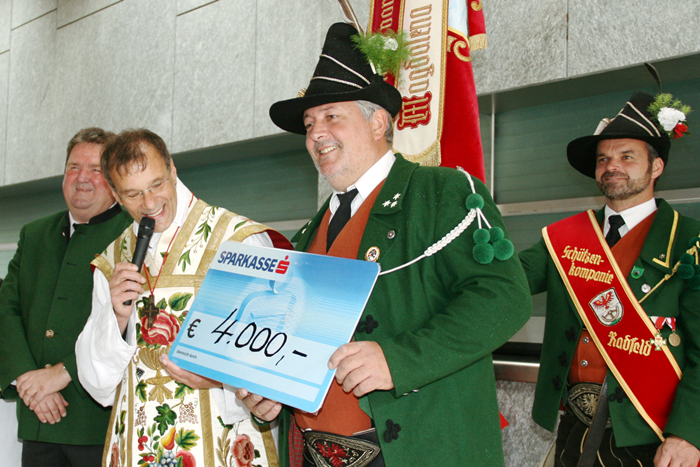 Der Gottesdienst fand im Veranstalungszentrum der Gemeinde statt, dabei dankte der Pfarrer Dieter Reutershahn unserem Schützenkameraden Hölzl Erich für die Ausrichtung des Pfarrfestes im Sommer 2012. Erich Hölzl überergab unserem Pfarrer einen Scheck über 4000 Euro.